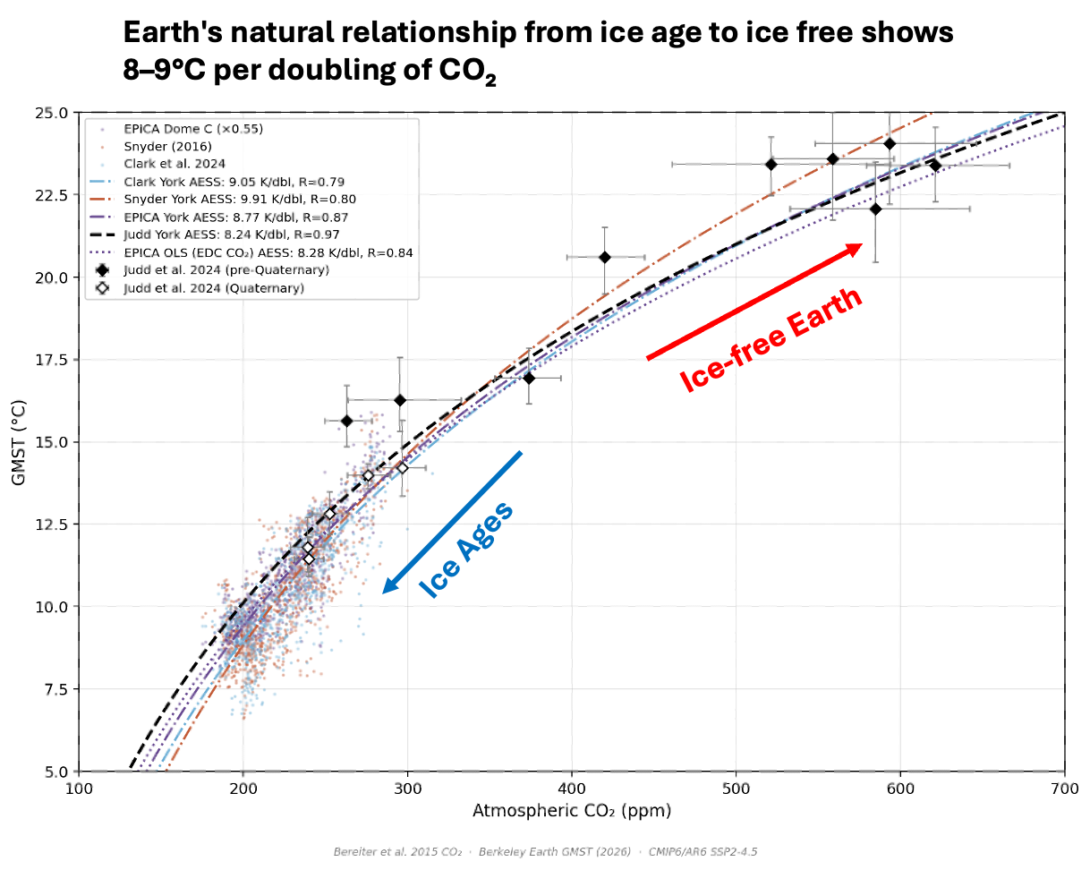 The figure spans Earth’s climate from deep ice ages — CO₂ near 175 ppm, global temperatures near 8°C — to the warm Cenozoic periods when there were no significant continental ice sheets and sea levels were 60–70 meters higher. A natural question is whether the ice-albedo feedback drives this slope — and whether it therefore only applies to glaciated climates. The figure addresses this directly: most of Judd’s data comes from greenhouse climates with little or no continental ice — the Eocene, Oligocene, early Miocene — yet the same slope holds across the full range. If ice-albedo were the dominant driver, the relationship should look different in ice-free regimes. It does not, which Judd et al. themselves describe as surprising. The relationship appears to be a fundamental property of the Earth system across a wide range of boundary conditions, with and without ice sheets.